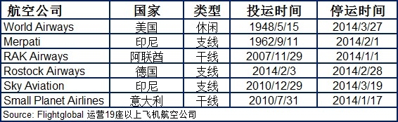 根據Flightglobal收集的數據顯示,2014年第一季度有5家航空運營商停運,另外還有一家老牌美國運營商世界航空(World Airways)因未能籌集到脫離破產保護所需的資金而于3月26日停止了運營。