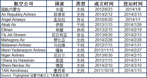 不過,在2014年第一季度有十多家新建航空公司開始運營,包括夏威夷航空下屬的歐哈納支線航空(Ohana)和中國國航在內蒙古新建的合資子公司等。