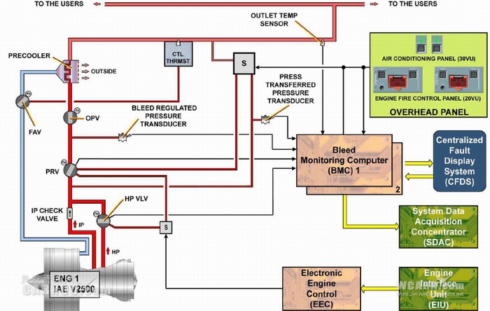 系統(tǒng)大致工作情況為:使用發(fā)動機引氣時,通過發(fā)動機中壓級或高壓級引來的空氣(當(dāng)中壓級引氣不足時高壓引氣活門打開)先經(jīng)過PRV(調(diào)節(jié)出口壓力保持在44PSI)再經(jīng)過OPV超壓活門(75PSI活門開始關(guān)閉)后在預(yù)冷器經(jīng)過風(fēng)扇空氣活門引來的冷卻空氣進(jìn)行冷卻,使經(jīng)過調(diào)節(jié)的預(yù)冷器出口溫度保持在200度, 在經(jīng)過相應(yīng)的溫度和壓力調(diào)節(jié)后,將符合需要的引氣提供給各個用戶。