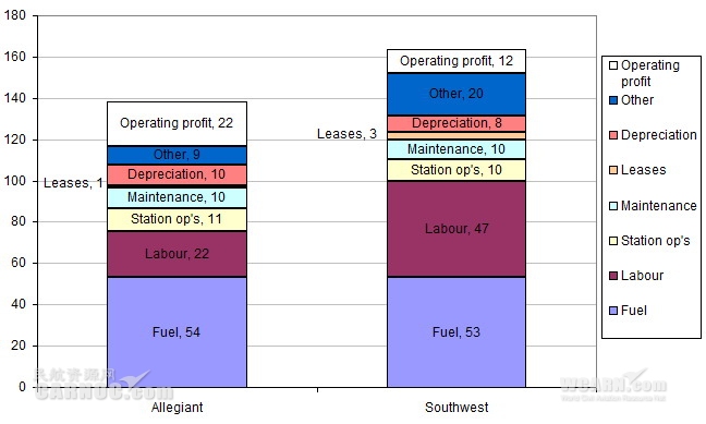 Allegiant 的每乘客成本比較美國西南航空公司而言顯示都是類似的,每旅客燃油成本水平53美元附近。雖然西南航空公司的飛機可能是更節(jié)省燃油,Allegiant的機隊由166座MD-83主導(dǎo),而西南航空的主要飛機是149座架波音B737-700,整體而言Allegiant的機隊座位平均數(shù)量較高。在2013年引入(相對)年輕的空中客車飛機,應(yīng)有助于改善Allegiant機型的燃油效率。但是在另一面,空客飛機的引入將增加公司運行的復(fù)雜性和減少其飛行機組人員跨越整個機隊操作的靈活性。有趣的是,公司和西南航空也有類似的每旅客機務(wù)維護費用,10美元左右,這意味著Allegiant每架飛機更高載運率和更多的座位抵消了每架飛機較高的維修費用。