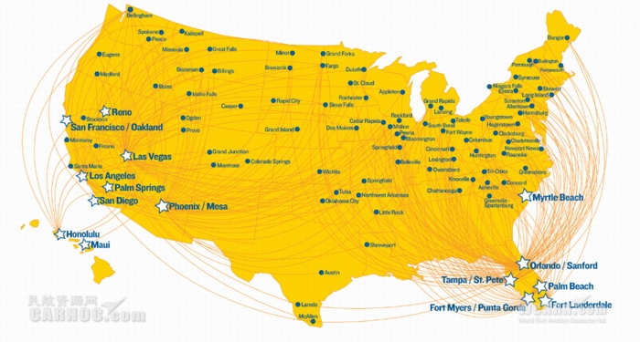 公司的航線網(wǎng)絡(luò)涵蓋美國各地86座小城市和13個休閑目的地,范圍從美國東海岸到西海岸,從北到南。其運行的城市人口很少:2013年86%的人口少于90萬,超過三分之一不到30萬。