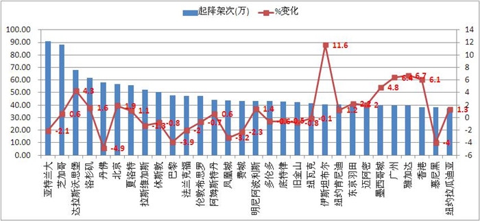 在飛機起降架次的增長方面,土耳其伊斯坦布爾國際機場增長最大,達到11.6%。其他增長較快的機場還有:廣州白云機場增長6.4%,印度尼西亞的雅加達國際機場增長6.7%,香港國際機場增長6.1%。