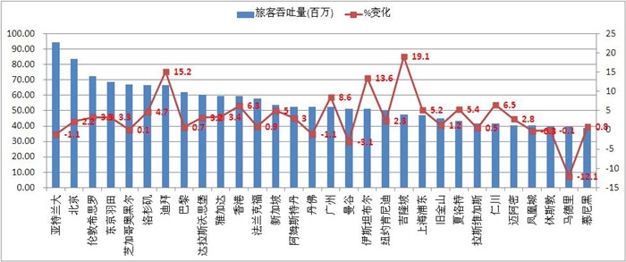 下圖2為全球2013年旅客吞吐量最大的30家機場及其增長情況。