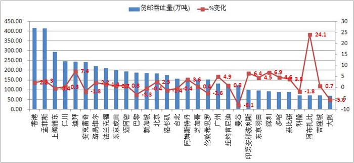 圖3 2013年全球貨郵吞吐量最大的30家機場及其增長情況分布圖