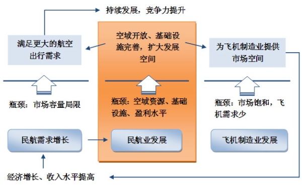 國產飛機在發展初期,主要市場在國內。而在國內民航業發展面臨瓶頸的形勢下,很難為大飛機提供更多的訂單。為了給國產飛機提供更廣闊的市場空間,同時滿足快速增長的航空出行需求,國家需要在空域資源、機場設施建設和管理體制方面實施更大力度的改革和更多的投入。發揮航空運輸和飛機制造兩個產業的相互支撐作用,為經濟增長提供新的推動力(圖1)。